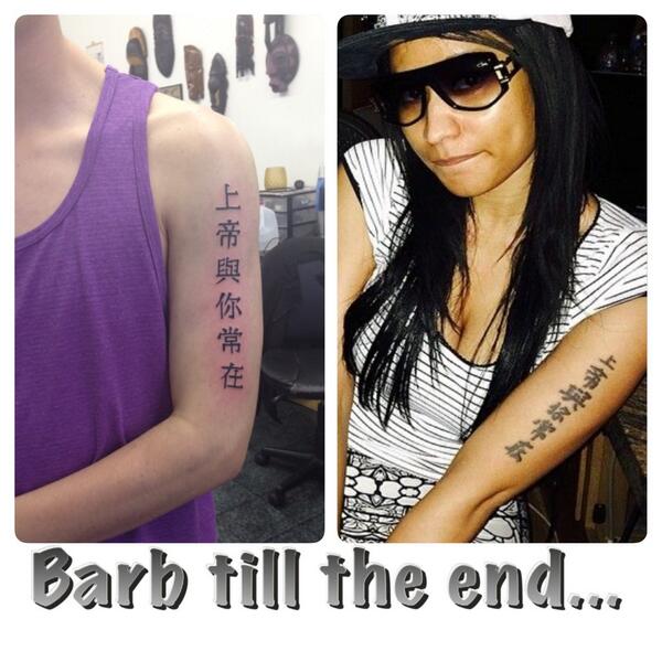 Its a chinese inscription tattoo on her left arm. A post shared by barbie atnickiminaj on jul 4 2018 at 1032pm pdt. The tattoo means god is always with you.